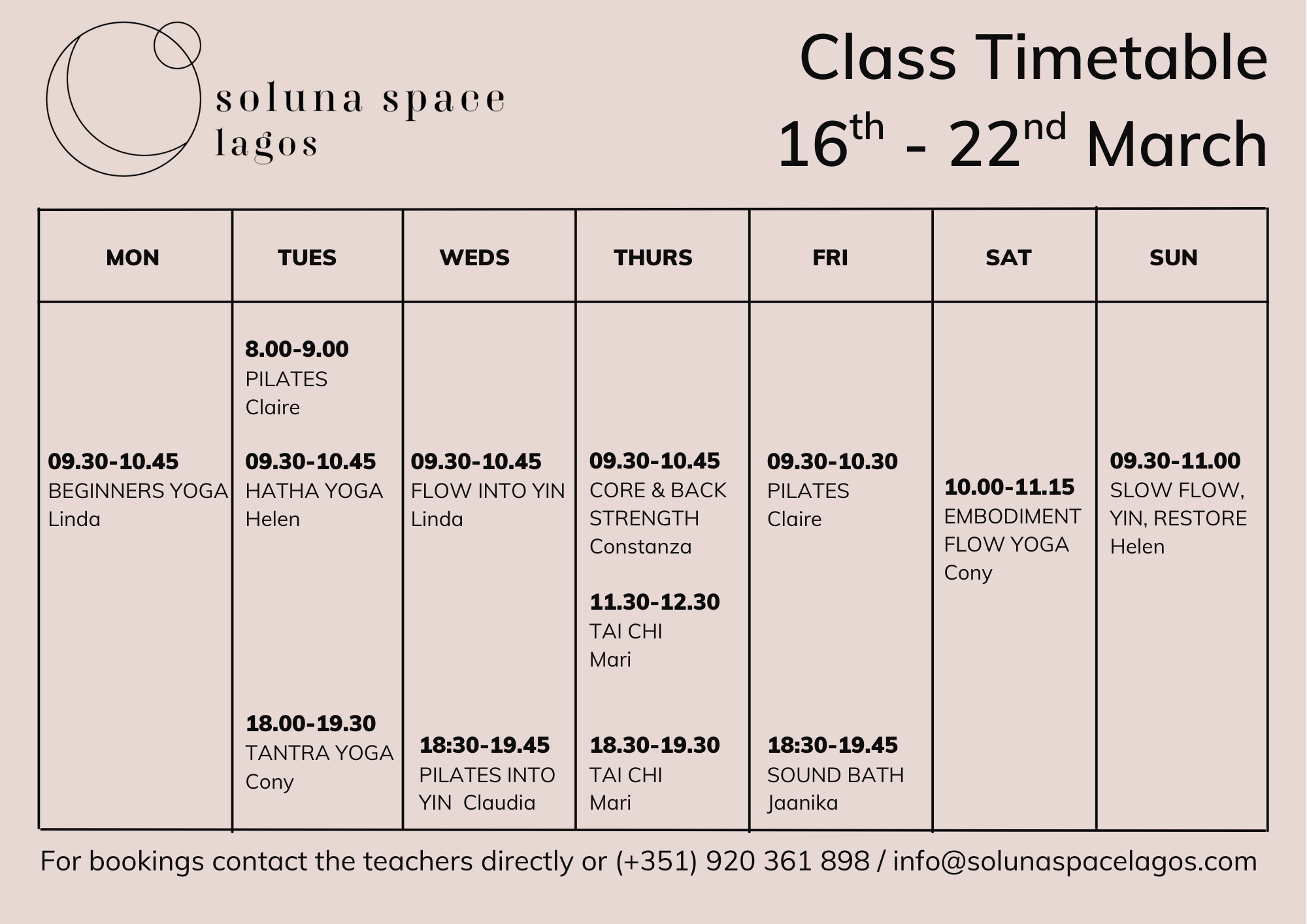 WEEKLY SCHEDULE Please check our daily Instagram stories for any last minute changes. Cost per class varies €12 / €15 depending on the length of class. See Booking Link for full details.